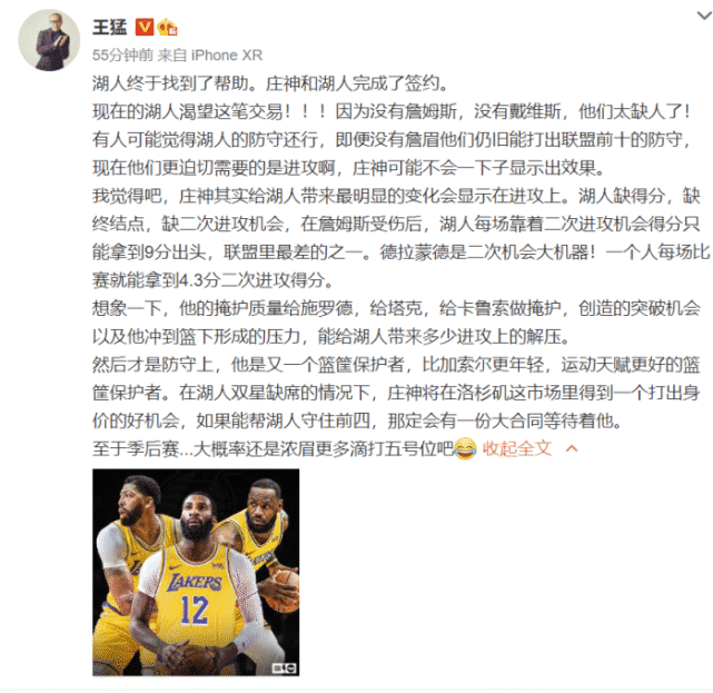 来源:JRS直播网03-29 16:28JRS直播网讯 庄神官宣加盟湖人,一时之间这支卫冕球队又重新成为了人们热议的焦点,纷纷期待着詹眉回归后他们一起对抗篮网的豪华阵容。