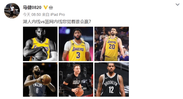 国内篮球名嘴马健则提出了问题“湖人内线vs篮网内线您觉着谁会赢?”这样的比较没打比赛很难说,两队都算是人员齐备阵容豪华,湖人这边有浓眉、庄神、小加、哈雷尔,篮网有小乔丹格里芬克拉克斯顿和阿德,而且理论上老詹、杜兰特、库兹马、杰夫格林也会打内线,就看教练如何用人以及磨合情况了!