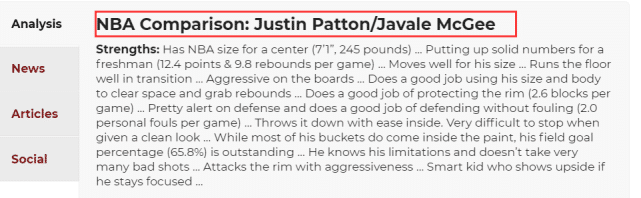 NBA选秀网站当时为他列出的模板是帕顿(注:火箭目前的替补中锋)和麦基,但他最终没能被任何球队选中。