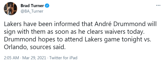 他希望能赶上湖人今天对魔术的比赛(北京时间3月29日上午10点)