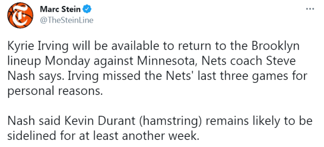 欧文没有出现在名单上,这意味着他将复出对阵森林狼。主帅纳什确认了欧文复出的消息,过去三场比赛,欧文由于个人原因缺阵,美媒报道称他是去陪产了。