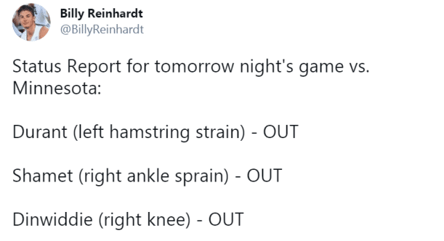 来源:JRS直播网03-29 16:05JRS直播网讯 北京时间3月29日,篮网队安排了一次训练,备战明天主场对森林狼的比赛。篮网官方也公布了明天的伤病名单,三人确定缺席:杜兰特(左腿筋拉伤)、沙梅特(右踝扭伤)和丁威迪(右膝伤病)。