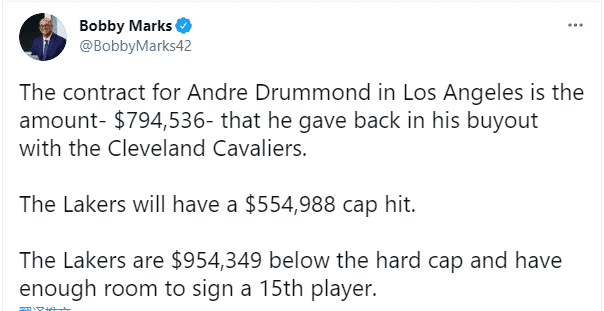 庄神签约湖人的合同细节曝光,据薪资专家Bobby marks报道,庄神签约湖人的合同金额是79.5万美元,这是他与骑士达成买断协议时放弃的薪水,湖人距离硬工资帽还差95万美元,还能签下第15名球员。
