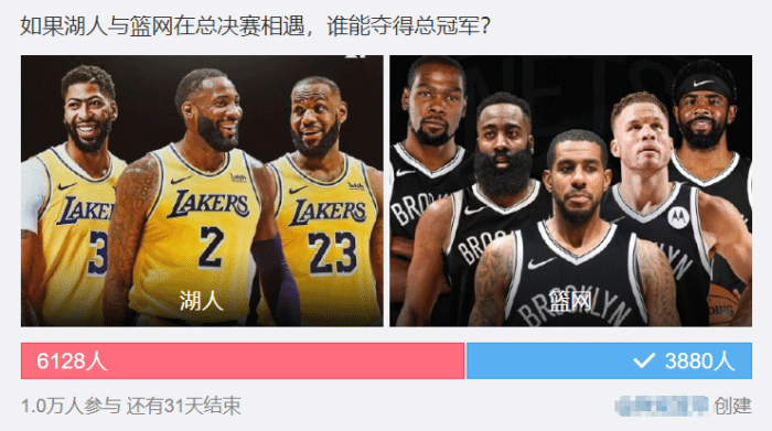 湖人篮网总决赛相遇谁夺冠?上万球迷参与投票,三巨头KO七星阵