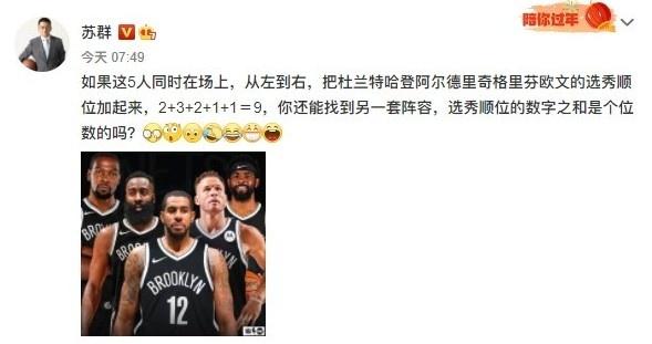 国内篮球名嘴苏群老师更新社媒表示“如果这5人同时在场上,从左到右,把杜兰特哈登阿尔德里奇格里芬欧文的选秀顺位加起来,2+3+2+1+1=9,你还能找到另一套阵容,选秀顺位的数字之和是个位数的吗?”历史唯一的球队,再也找不出第二支了,比较接近的可能是当年的热火三巨头以及ShowTime时期的湖人了!