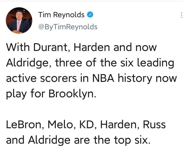另据美记报道,篮网的这套豪阵还包含了三位在现役总得分排名前六的球员,他们是杜兰特(排名第3)、哈登(排名第4)和阿尔德里奇(排名第6),其余三位是湖人的詹姆斯(1)、开拓者的安东尼(2)和奇才的韦斯布鲁克(5)。