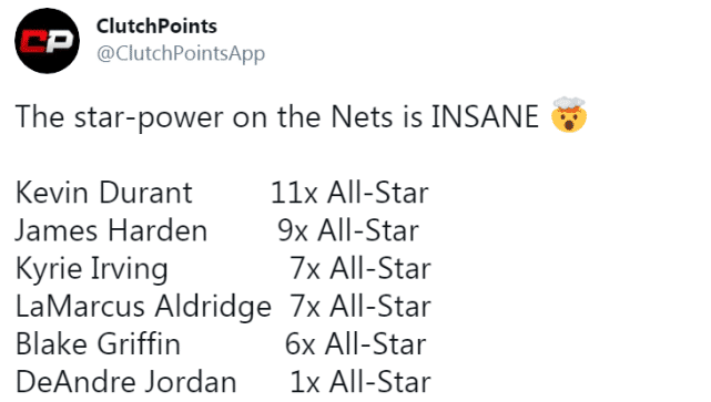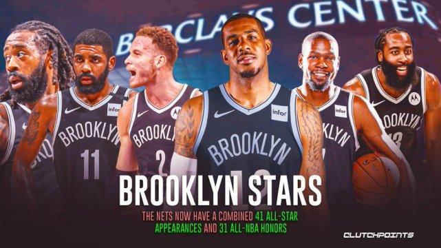 算上阿尔德里奇,目前这支篮网已经拥有6位曾经入选全明星的球员。累计入选全明星41次。其中杜兰特11次、哈登9次、欧文7次、阿德7次、格里芬6次、小乔丹1次。他们还累计入选31次最佳阵容。6位全明星组成的豪阵,让布鲁克林星光熠熠。