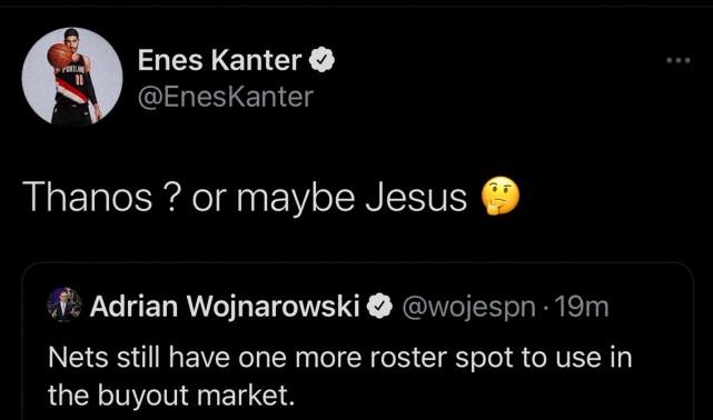 篮网的一顿操作猛如虎,对手也只能羡慕嫉妒恨了。沃纳罗斯基报道称,篮网还有一个阵容名额可以用于签约买断市场上的其他球员时,坎特转发这一报道评价道:“灭霸?或者可能是上帝?”