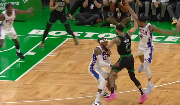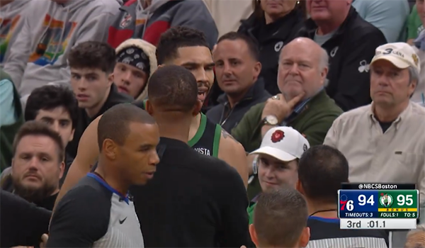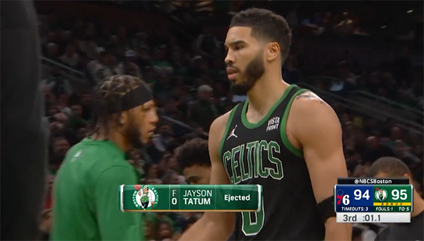 裁判回放这一幕后,裁判升级判罚,塔图姆吃到一级恶意犯规。