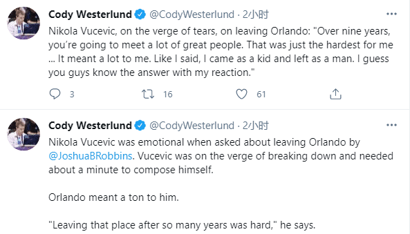 身穿公牛连帽卫衣接受赛前采访,谈到离开奥兰多这个话题时,武切维奇情绪一度失控擦拭泪水,然后强忍泪水不哭泣,表示:离开那个呆了那么多年的地方非常艰难。最难的就是那里的人,在九年的时间里,你会遇到一些很好的人,我小时候来到奥兰多,离开时已是大男人。
