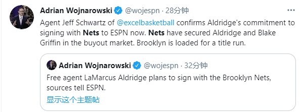 来源:JRS直播网03-28 12:04JRS直播网讯 马刺旧将阿尔德里奇已经做出最终决定,最终选择加盟篮网冲击总冠军,据ESPN名记沃纳罗斯基报道,阿德将和篮网签下一年老将底薪合同;阿德联手三巨头冲冠,篮网又成功捡漏,湖人和快船又白忙活了,这下篮网阵容实力再次提升,联盟大结局了吗?