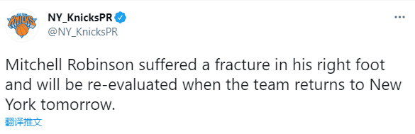 来源:JRS直播网03-28 12:00JRS直播网讯 北京时间3月28日,尼克斯和雄鹿比赛中出现意外伤病事件,尼克斯首发中锋米切尔-罗宾逊仅打6分钟便因伤退赛,伤情确诊为右脚骨折,尼克斯官宣这一坏消息,他将在明天返回纽约后再次接受伤势的评估。