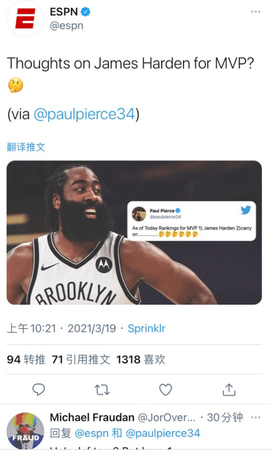 而在赛后他霸气回应了MVP的排名“我认为我就是MVP,就是这么简单”大胡子一般情况下都很低调,他也一直在强调自己加盟篮网目标只有冠军,不在乎个人荣誉和数据!不在乎是不在乎,但需要得到更多人的尊重,以他的数据和表现难道不配进入MVP榜单前五吗?目前他排在第六,也就是说官方认为截止到现在有5个人比他更出色!