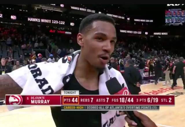 来源:JRS直播网03-29 11:44JRS直播网讯 北京时间3月29日,NBA常规赛老鹰主场123-122险胜凯尔特人。此役,老鹰主将德章泰-穆雷在终场前0.1秒完成中投准绝杀,个人加时赛独揽全队的全部11分,成为老鹰的救世主。赛后,德章泰-穆雷也提到了科比。根据统计,穆雷44次的运动战出手创造了老鹰78年队史新纪录,此前的纪录是鲍勃-佩蒂特保持的43次。在没有特雷杨的情况下,穆雷继续扛着老鹰前进。
