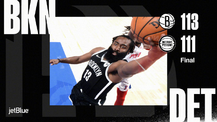 JRS直播网3月27日讯 今日NBA常规赛,篮网客场挑战活塞。篮网目前30胜15负排名东部第3,活塞则12胜31负排名东部垫底。比赛开始,活塞率先发力取得5分领先,篮网逐渐找到进攻状态将比分反超,首节结束,篮网领先活塞7分。次节开始,斯图尔特肘击格里芬遭驱逐,哈登连续得分将分差逐步扩大,半场战罢,篮网59-50领先9分。易边再战,活塞外线手感恢复,抓住篮网失误一度将比分反超,但哈登最后时刻发力连得5分,篮网82-78领先4分结束第三节。末节初段,篮网下起三分雨,将比分优势迅速扩大至12分,活塞外线逐渐找到手感,一度将比分扳平,关键时刻,杰夫-格林命中关键三分,哈登6犯离场,随着活塞最后一攻不中,最终篮网113-111险胜活塞。