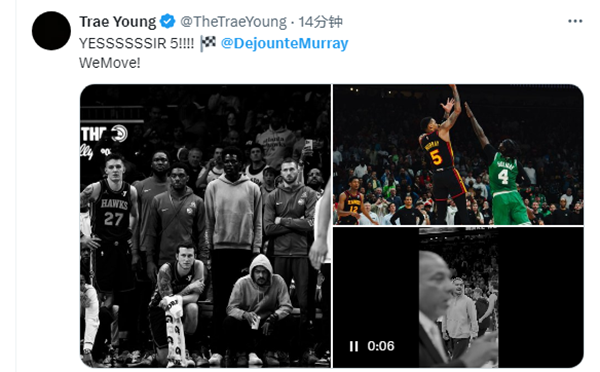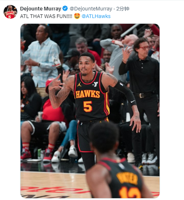 穆雷转发纪录,并且发推向科比威少致敬,直言:我太累了;穆雷晒照庆祝胜利,写道:亚特兰大,那很有意思;特雷-杨也晒出穆雷迎着霍乐迪绝杀的名场面,写道:太棒了,我们都爱你。