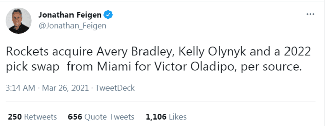 来源:JRS直播网03-26 15:40JRS直播网讯 北京时间3月26日,在交易截止日,火箭将奥拉迪波送往热火,换来了布拉德利、奥利尼克和2022年的首轮互换权。这笔交易被火箭球迷疯狂吐槽,美媒也认为火箭低价甩卖了这位昔日的全明星。