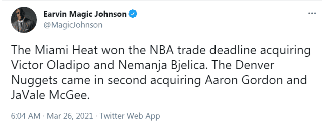 至少“魔术师”约翰逊认为热火是今年交易截止日的最大赢家。他写道:“迈阿密热火通过得到奥拉迪波和别利察,成为交易截止日的最大赢家。丹佛掘金排名第二,他们得到了戈登和麦基。”你们看好交易后的热火吗?