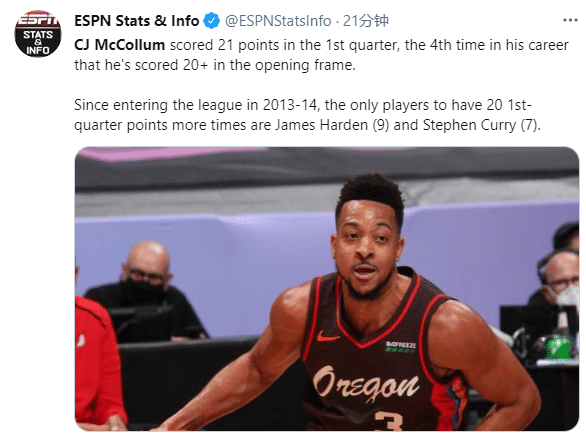 第一、麦科勒姆生涯第四次首节20+,自从他进入联盟以来,只有哈登(9次)和库里(7次)首节20+次数比他多。第二、麦科勒姆三分命中率突破1100记大关,生涯前500场达成这样的神迹成为历史第五人,另外四人分别是库里、汤普森、利拉德和比尔
