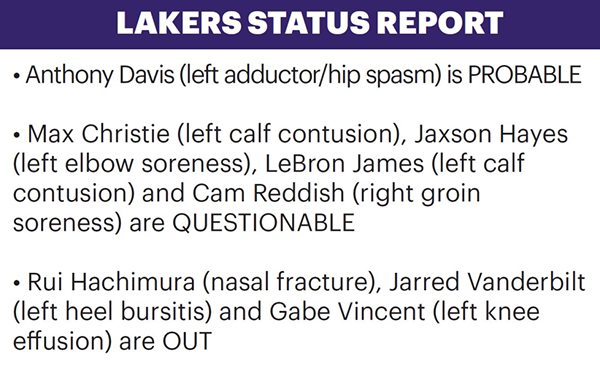 伤情报告显示,戴维斯(左内收肌,髋关节痉挛)是大概率出战(75%上场可能)。詹姆斯(左小腿挫伤)、雷迪什(右腹股沟酸痛)、克里斯蒂(左小腿挫伤)和海耶斯(左肘酸痛)均为出战成疑(50%上场可能)。八村垒(鼻骨骨折)、文森特(左膝积液)与范德比尔特(左脚跟滑囊炎)将继续缺席比赛。