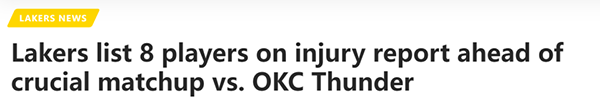 湖人的常规阵容是14名球员,也就是说其中超过半数的球员都有伤在身。詹姆斯和浓眉都在带伤作战,赛季至今,詹眉分别都只缺席了一场比赛,戴维斯没有出战11月9日客场对火箭的比赛,而詹姆斯没有出战11月13日主场对开拓者的比赛。湖人的战绩也不算理想,对阵雷霆前,他们只取得11胜8负,排名西部第七。