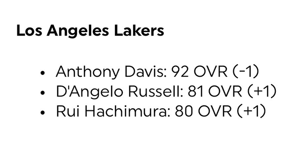 另外,湖人记者报道称,NBA2K数值更新,湖人队有三人发生变化。浓眉的数字下降1点,目前是92;拉塞尔和八村垒都上升1点,拉塞尔目前是81,八村垒是80。