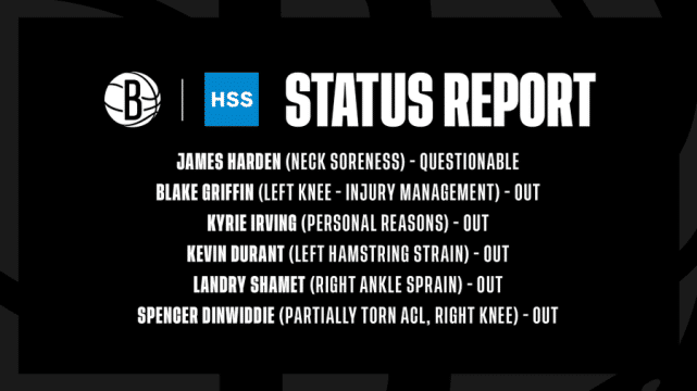 伤病报告显示,五名缺战的球员分别是格里芬(左膝伤病管理)、欧文(个人事务)、杜兰特(左腿筋拉伤)、沙梅特(右踝扭伤)、丁威迪(右膝韧带部分撕裂)。哈登的出场状态和上一场对开拓者赛前是一样的,预计要到赛前热身后才能最终决定能否出场。