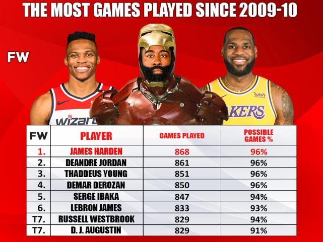 赛季至今,哈登场均出场38分钟,排名联盟第一。数据显示,自从2009-10赛季以来,哈登参加了868场比赛,出勤率高达96%,排在所有球员之首。位列第2-6位的依次是小乔丹、赛迪斯-杨、德罗赞、伊巴卡、詹姆斯,并列第7位的是韦斯布鲁克和奥古斯丁。