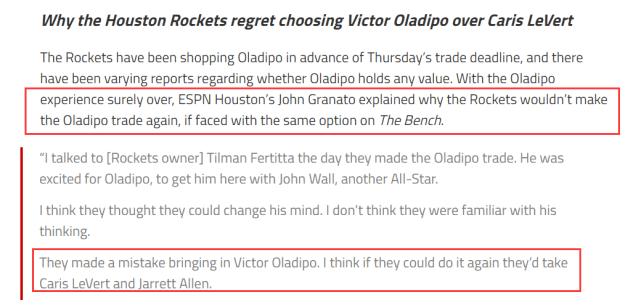 ESPN记者John Granato在一档播客节目中透露,如果火箭能回到交易当天,他们不会再去换奥拉迪波。