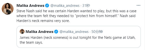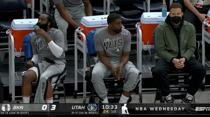 由于篮网三巨头全都不打,哈登本想继续带伤出战却遭主帅拒绝,纳什认为哈登需要学会保护自己,哈登被迫轮休不打;比赛正式开打后,不到5分钟,篮网被爵士打出16-4冲击攻势,康利一个人就贡献10分,篮网进攻火力不足还防不住爵士,分差瞬间被拉开。