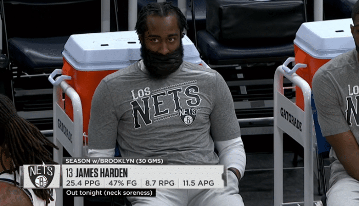 狂输21分!篮网全队17分被打爆,哈登想带伤出战遭拒:坐场边吃零食