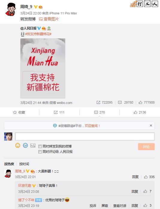 在耐克的事件爆发后,耐克签约球员周琦第一时间在社交媒体上表态:大美新疆,显然周琦有了硬刚耐克的打算。不过相比周琦,相比其他签约球星,这一次娱乐圈的流量小生王一博的动作更加迅速。