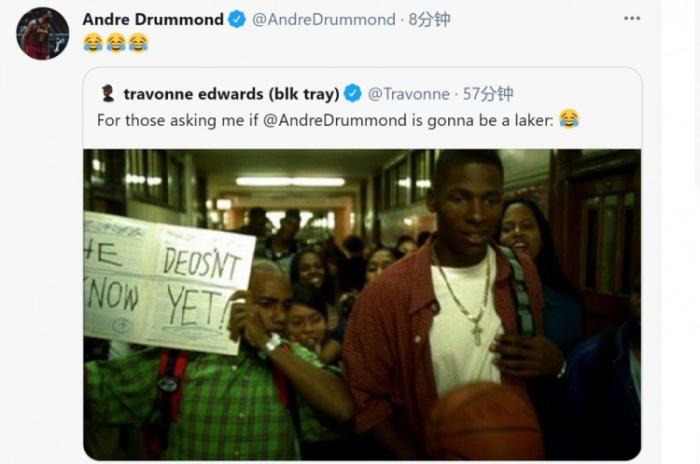 有记者在推特上晒出一张趣图并写道:“送给那些问我德拉蒙德会不会加入湖人的人。”图中一群人围着雷-阿伦,阿伦旁边有个人举着牌子,牌子上写着:“他现在还不知道!”德拉蒙德本人转发并附上三个笑哭的表情,与此同时他还在社媒上频繁点赞湖人动态,这很可能是在示好!