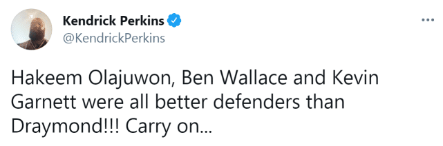 一些前NBA球员也对格林做出了回应。已经转行当球评的帕金斯写道:“哈基姆-奥拉朱旺、本-华莱士、凯文-加内特都是比德雷蒙德更好的防守者。”
