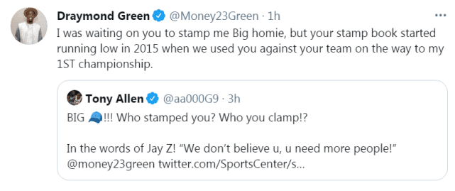 有趣的是格林本人也回应了阿伦的质疑。“我一直在等你给我盖章,大兄弟,可是2015年通往我第一座总冠军的道路上,我们用你来对付你的球队,你的印章本真是供不应求。”显然,格林用昔日的交锋表现在讽刺阿伦。2015年的西部半决赛,勇士4-2淘汰灰熊。