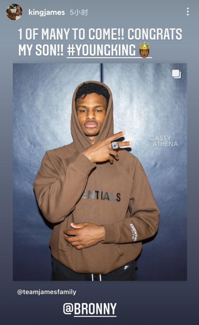 恭喜年轻的国王!詹姆斯晒儿子夺冠写真:未来许多戒指中的一个