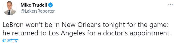 来源:JRS直播网03-24 11:33JRS直播网3月24日讯 湖人客场对阵新奥尔良鹈鹕,詹姆斯已经暂时离开球队,据湖人跟队记者Mike Trudell报道,勒布朗-詹姆斯不在新奥尔良,他已经返回洛杉矶接受医生的治疗,湖人官方宣布这一消息。