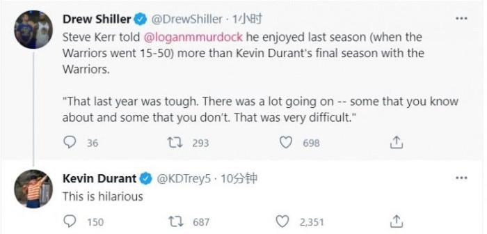 科尔:相比于2019年我更喜欢上个赛季的经历,杜兰特回怼:真搞笑!