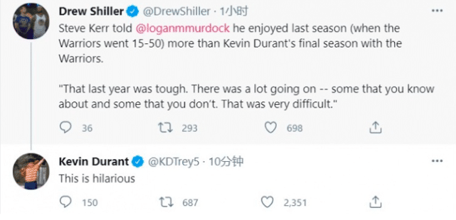在科尔的言论被报道后,迅速地迎来了杜兰特的围观,这次杜兰特连小号都懒得上了,他直接用大号回复:这真的很搞笑。显然,杜兰特认为科尔的言论不仅否定了自己为勇士队付出的跟腱,还把自己当成是勇士队当年更衣室不够团结的因素。