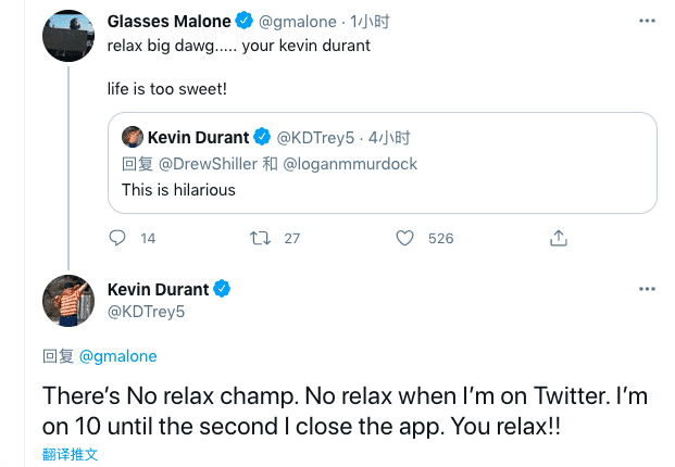 另外杜兰特这边因为不明真相所以也被带节奏了!不少网友在推特中回复杜兰特,有人说“兄弟,你真的必须停止对所有事情都要去回复,你为什么这么在乎呢?”说唱歌手Glasses Malone回复道:“放轻松点大兄弟……你可是凯文-杜兰特。生活不是很美好嘛!”