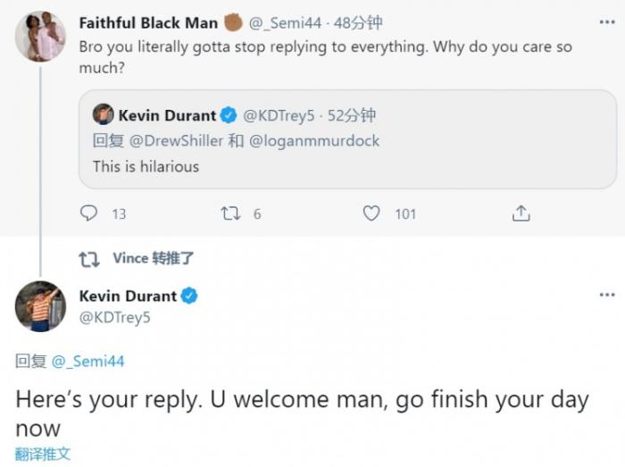 杜兰特则“回怼”:这是对你的答复,不用客气,现在就去结束你的一天吧。然后还表示“没有所谓的轻松的冠军,我在上推特时也没有轻松过。我10点才关推特软件,你们才应该放轻松些。”