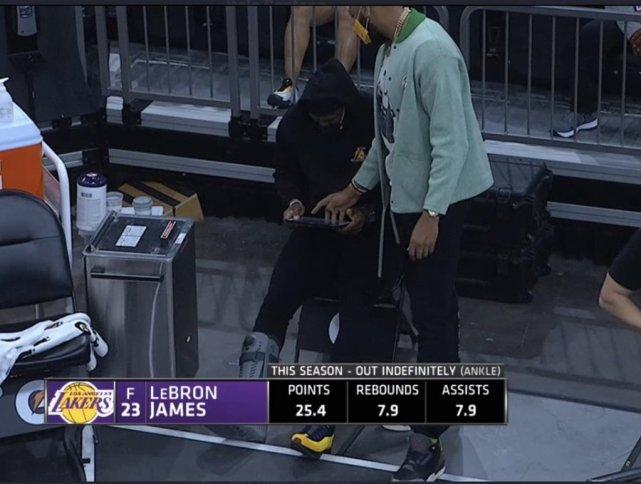 詹姆斯在对太阳的比赛中现身,他坐在替补席上,身边是同样没有出场的浓眉和小加。詹姆斯的右脚已经穿上了保护靴。