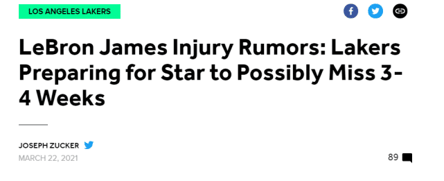 詹姆斯伤情更新!名记透露他将缺阵三至四周,湖人季后赛门票堪忧?