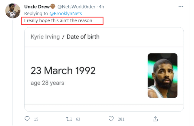 欧文缺席这次客场之旅的具体原因没有曝光,但球迷们已经开始猜测。有球迷截图欧文的个人资料,并写道:“我真的希望他不是为了这个原因缺席。”资料显示,欧文的生日是3月23日(当地时间)。