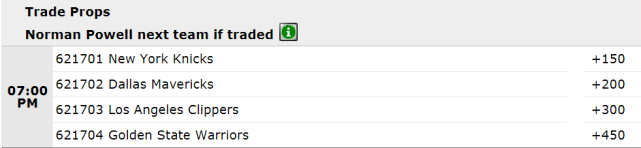 鲍威尔近来状态非常出色,3月份至今场均得分27.1分。他也是截止日前离队的热门球员。目前有四支球队出现在鲍威尔的交易下家赔率榜上。领跑的是尼克斯(+150),排名第二至四位的依次是独行侠、快船和勇士。