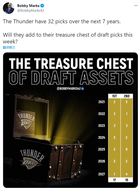 来源:JRS直播网03-23 10:54JRS直播网3月23日讯 ,距离NBA交易截止日已经只剩下3天时间,各队也都希望在最后时刻进行补强或者交易。而对于本赛季无欲无求的雷霆来说,他们甚至可能会继续出售球员囤积选秀权。NBA薪资专家Bobby Marks晒出了雷霆在未来7年的选秀权,竟然达到了疯狂的32个!NBA头号“屯粮”大队,实至名归。