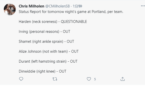 篮网官宣伤病报告!杜兰特欧文都不打,5人缺战+哈登受伤也可能不打