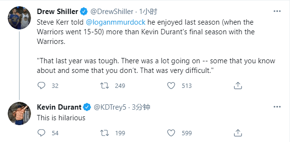 勇士记者Drew Shiller发推写道:科尔表示他更享受上个赛季(15胜50负),比杜兰特在勇士的最后一年还要享受;并且截取科尔的一段话:去年很艰难,发生了很多事——有些你们知道的,有些是你们不知道的,总之就是非常艰难。