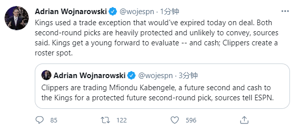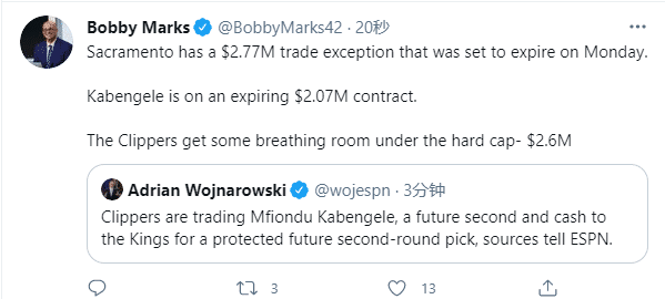 来源:JRS直播网03-23 10:29JRS直播网3月23日讯 随着交易截止日临近,快船已经行动了,和国王达成3换1交易,快船将卡本盖莱+二轮签+部分现金送到国王,换取一个受保护二轮签;随后名记补充报道,国王使用了一个本应在今日到期的交易特例,这两个次轮签都受到严格保护,不太可能转手。