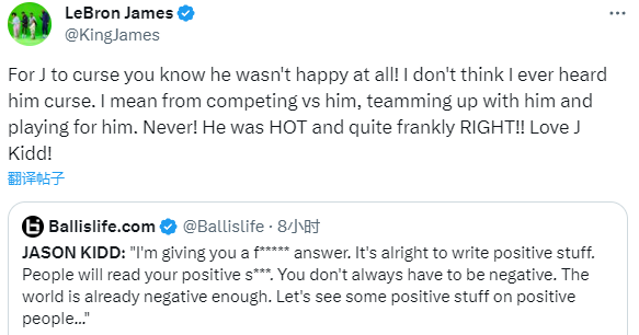 看到独行侠主帅基德爆粗怒怼记者的言论,詹姆斯转发并且写道:对于基德来说,他说脏话了,你知道的,那他一定是非常的不开心了!在我与他竞争,与他合作以及为他效力的经历中,从未听他骂过脏话。他有些激动了,但老实说,他说得是对的,我爱基德。